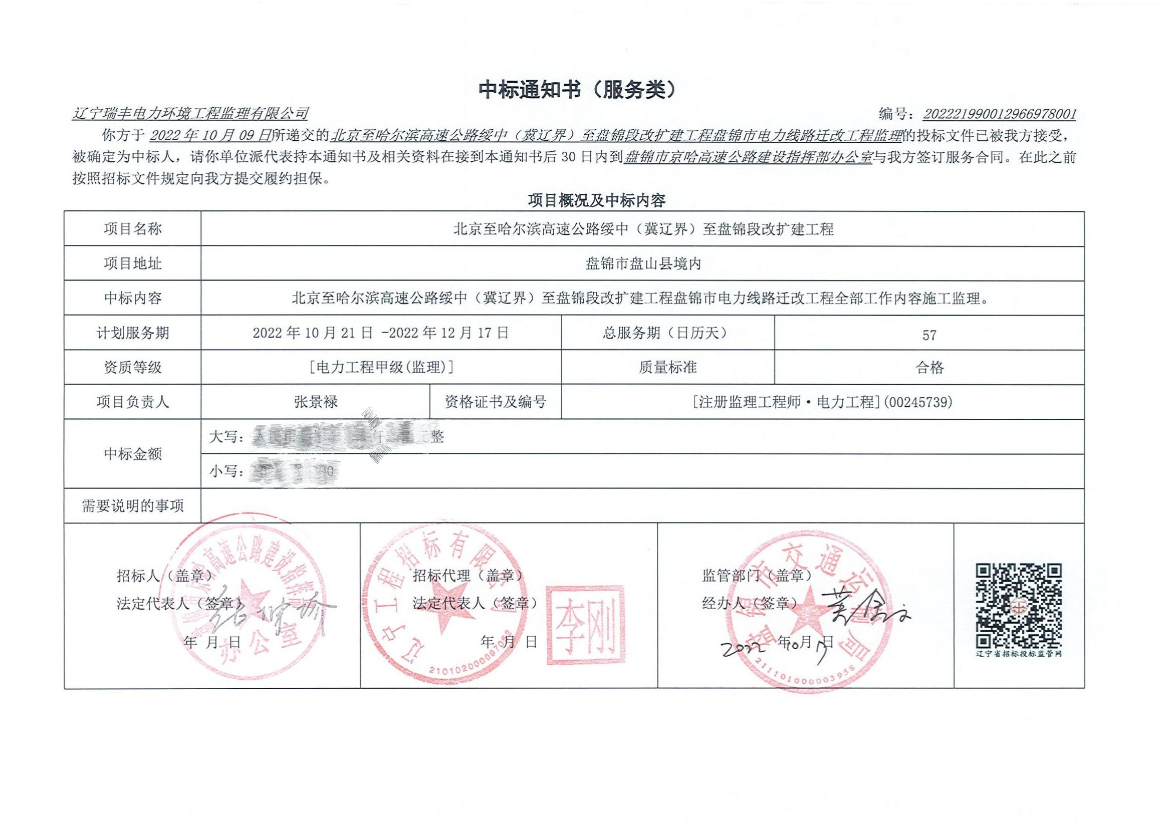 中標(biāo)喜訊-北京至哈爾濱高速公路綏中(冀遼界)至盤錦段改擴(kuò)建工程