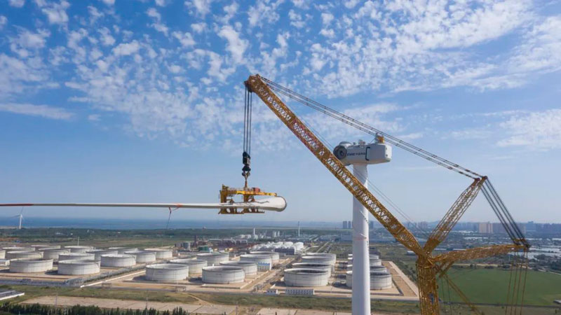 針對風(fēng)電部件的龐大和脆弱性,項目團隊經(jīng)過反復(fù)討論,不斷優(yōu)化施工工藝和流程,啟用4000噸級履帶式起重機全球首次塔式工況進行主吊,多臺副吊協(xié)同,通過水平單葉片吊裝方案和超高工況下互補模式進行吊裝,避免了吊裝過程中的損傷風(fēng)險,保障安全的同時提高施工效率。