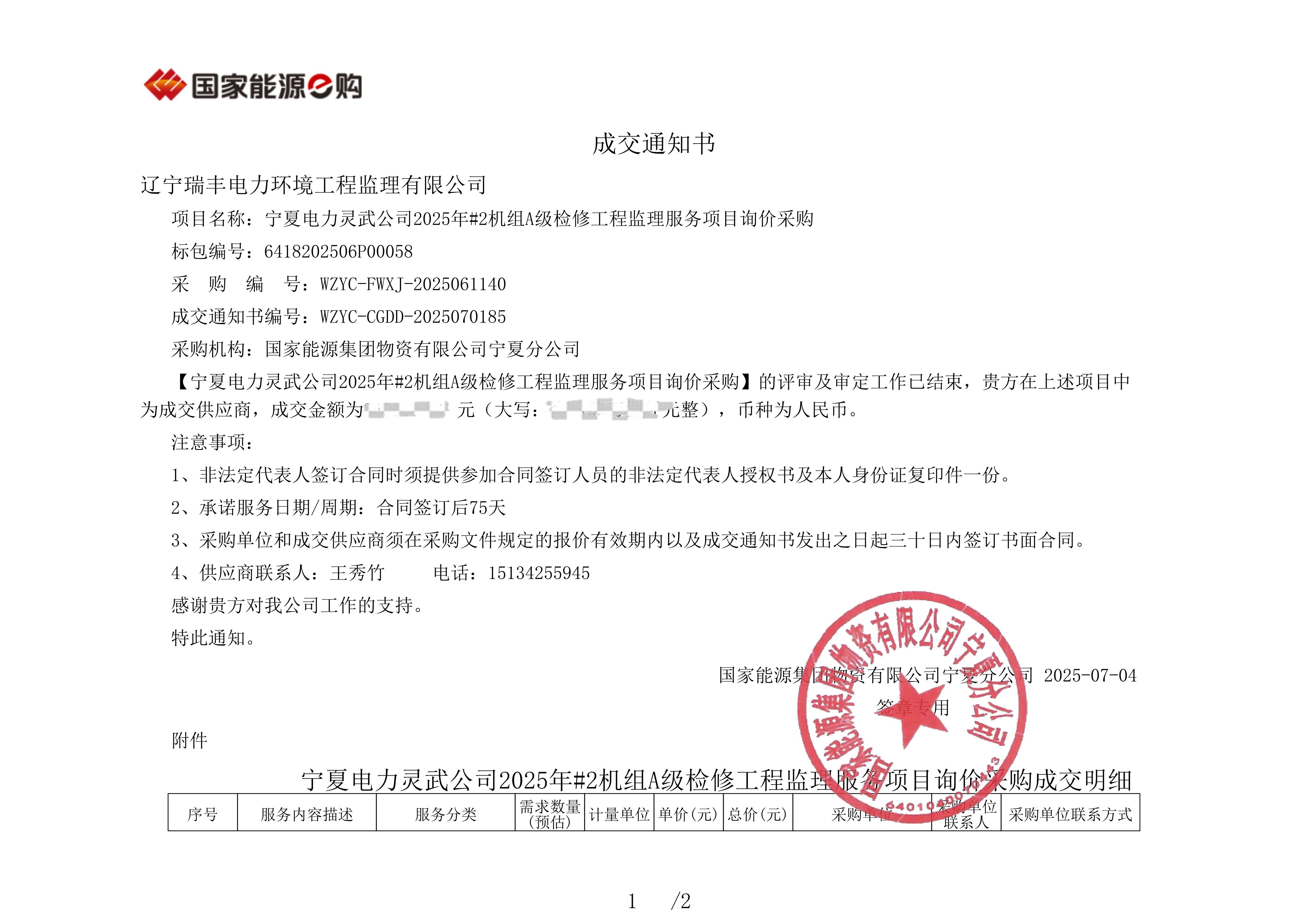 中標(biāo)喜訊-寧夏電力靈武公司2025年#2機(jī)組A級(jí)檢修工程監(jiān)理服務(wù)項(xiàng)目